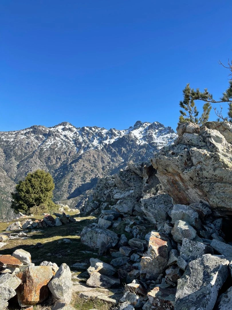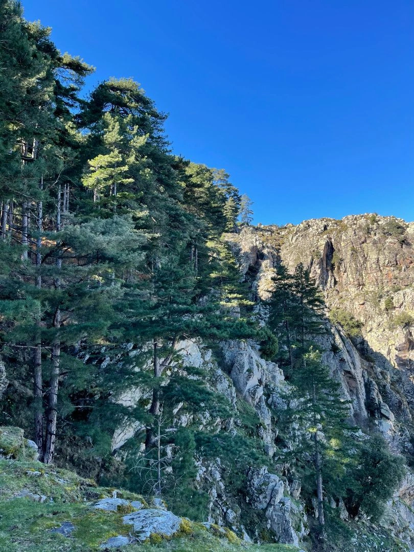 L’ascension s’effectue sur le versant nord du massif, principalement à travers une forêt dense où dominent les majestueux pins laricio, emblématiques de l’île, dont certains dépassent le siècle d’existence. Ombragé et agréable, le sentier débute en douceur avant de devenir progressivement plus soutenu. Sans difficulté technique ni passage d’escalade, la randonnée demeure toutefois exigeante en raison du dénivelé.
