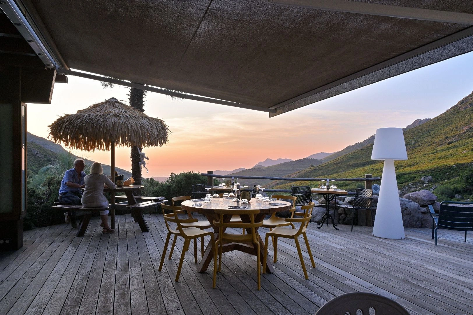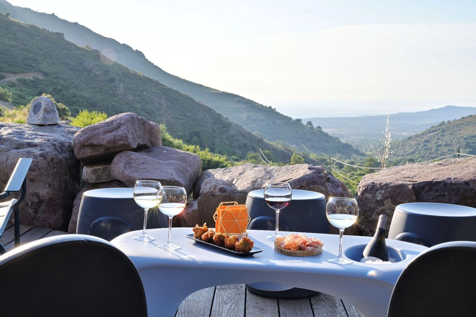 La terrasse panoramique surplombe la vallée de Calenzana, offrant une vue apaisante sur la Balagne.